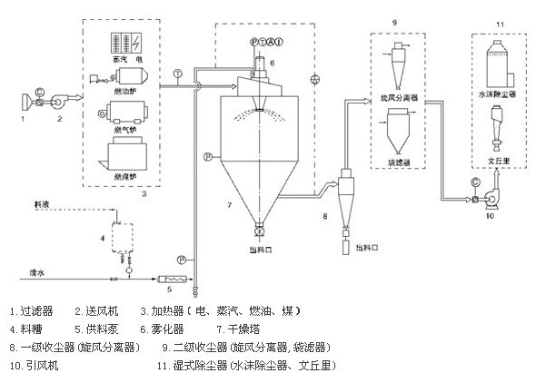 空氣通過過濾器和加熱器,進入干燥器頂部的空氣分配器,熱空氣呈螺旋狀均勻進入干燥器。料液由料液槽經過濾器由泵送至干燥器的離心霧化器,使料液噴成績效的霧狀液滴,料液和熱空氣并流接觸水分迅速蒸發(fā),在短時間內干燥為粉末狀成品。成品由于干燥塔地步和旋風分離器排除,廢棄由風機排出。