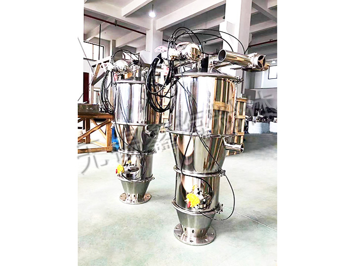 真空上料機中裝有壓縮空氣反吹裝置,每次放料時,壓縮空氣脈沖反吹過濾器,把吸附于過濾器表面的粉末打落下來,以保證吸料能正常運行。